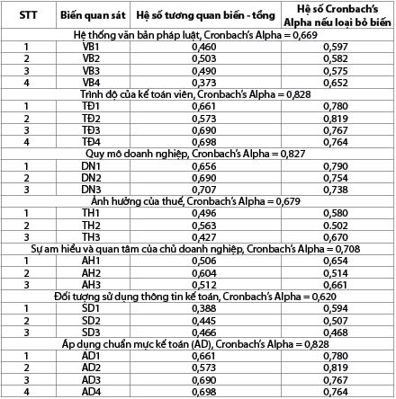 Bảng 2: Bảng tổng hợp kết quả kiểm định thang đo các nhân tố ảnh hưởng đến việc áp dụng chuẩn mực kế toán
