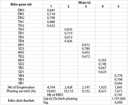 Kết quả phân tích nhân tố cho thấy chỉ số KMO của các biến độc lập là 0,741 > 0,5, điều này chứng tỏ dữ liệu dùng để phân tích nhân tố là hoàn toàn thích hợp. Hệ số Chi bình phương của kiểm định Bartlett’s đạt 1197,000 với mức ý nghĩa Sig = 0,000 < 0,05. Như vậy, dữ liệu dùng để phân tích EFA là hoàn toàn phù hợp và các biến quan sát có tương quan với nhau trong tổng thể. (Bảng 3)