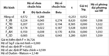Kết quả phân tích hồi quy cho thấy mức độ ảnh hưởng các biến độc lập đến việc áp dụng chuẩn mực kế toán, hệ số R2 = 0,602 và R2 hiệu chỉnh = 0,599, có nghĩa là 59,9% sự biến thiên của việc áp dụng chuẩn mực kế toán được giải thích bởi các nhân tố đưa vào mô hình, còn lại là các sai số ngẫu nhiên hoặc các yếu tố khác chưa được đưa vào mô hình nghiên cứu. Giá trị kiểm định F = 36,726 và giá trị Sig. = 0,000 < 0,05 nên mô hình có ý nghĩa thống kê, hệ số Durbin-Watson (d) = 2,149, nằm trong khoảng 1 < d = 2,149 < 3 nên mô hình không có tự tương quan (Mai Văn Nam, 2008). Hệ số phóng đại phương sai của các biến trong mô hình đều nhỏ hơn 2 nên không có hiện tượng đa cộng tuyến xảy ra. (Bảng 5)