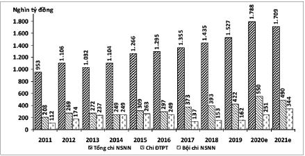 Từ năm 2011 đến hết năm 2021, NSNN đã chi hơn 14,57 triệu tỷ đồng, trong đó chi ĐTPT là 3,83 triệu tỷ đồng, chiếm 26,3%. Mặc dù có những năm, số chi NSNN thực hiện thấp hơn so với năm trước, song nhìn chung, quy mô chi NSNN cũng như chi ĐTPT trong giai đoạn này có xu hướng tăng, trong đó tốc độ tăng chi ĐTPT lớn hơn tốc độ tăng chi NSNN.