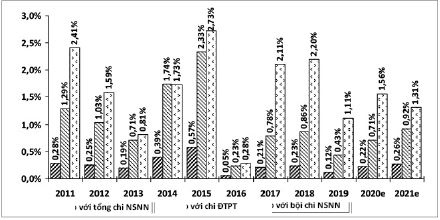 Đi cùng với sự mở rộng quy mô chi NSNN như trên, số bội chi NSNN trong giai đoạn này cũng có xu hướng tăng, với tốc độ cao hơn tốc độ tăng chi NSNN cũng như tốc độ tăng chi ĐTPT. Trong khi tốc độ tăng bình quân của chi NSNN và chi ĐTPT giai đoạn 2011 - 2021 lần lượt là 6%/năm và 8,9%/năm, thì tốc độ tăng bội chi NSNN bình quân lên tới 11,9%/năm. (Hình 4)