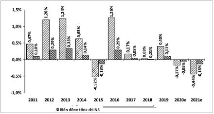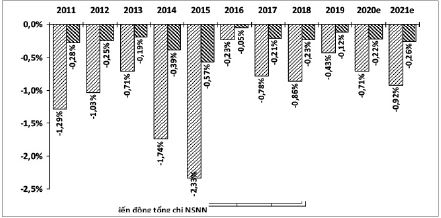 Đến lượt nó, sự biến động về quy mô chi NSNN lại dẫn đến sự thay đổi số bội chi NSNN. Theo đó, nếu bố trí đủ dự toán chi ĐTPT để thanh toán chênh lệch lãi suất và phí quản lý phát sinh thực tế cho VDB thì trong giai đoạn 2011 - 2021, bội chi NSNN mỗi năm sẽ tăng thêm 0,07 - 1,85% và bội chi NSNN cả giai đoạn sẽ tăng thêm 0,46%. Tuy nhiên, nếu không đưa số chênh lệch lãi suất và phí quản lý cho hoạt động TDĐT và TDXK của Nhà nước vào dự toán chi NSNN thì trong giai đoạn này, bội chi NSNN mỗi năm sẽ giảm 0,28 - 2,73% và bội chi NSNN cả giai đoạn sẽ giảm 1,55%.