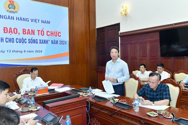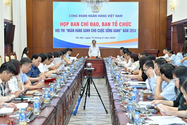 Thực hiện Nghị quyết Ban Chấp hành Công đoàn Ngân hàng Việt Nam (CĐNHVN) lần thứ 2, khóa VII; Kế hoạch số 419/KH-CĐNH ngày 17/6/2024 của CĐNHVN về kế hoạch và thể lệ Hội thi “Ngân hàng xanh cho cuộc sống xanh”; Quyết định số 271/QĐ-CĐNH ngày 11/9/2024 của Ban Thường vụ CĐNHVN về việc thành lập Ban Chỉ đạo Hội thi “Ngân hàng xanh cho cuộc sống xanh” năm 2024, chiều 13/9/2024, tại trụ sở Ngân hàng Nhà nước Việt Nam (NHNN), CĐNHVN đã tổ chức họp Ban Chỉ đạo, Ban Tổ chức và các Tiểu ban Hội thi “Ngân hàng xanh cho cuộc sống xanh” năm 2024.