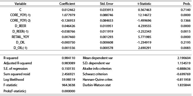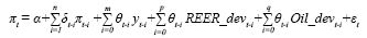 Trong đó: πt là lạm phát tổng thể so với cùng kỳ và được giải thích bằng diễn biến lạm phát trong quá khứ πt-i , sự vận động của chu kỳ kinh tế yt-i, sự biến động của tỷ giá REER_devt-i và tác động từ giá dầu thế giới Oil_devt-i .