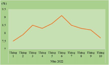 Kinh tế Trung Quốc tăng trưởng vượt dự báo nhưng lạm phát tiếp tục có dấu hiệu tăng tốc. GDP quý III/2022 tăng 3,9% so với quý trước, phục hồi từ mức giảm 2,7% trong quý II/2022. Quý III/2022 chứng kiến tốc độ tăng trưởng hằng quý mạnh nhất kể từ quý II/2020 nhờ một loạt chính sách và gói kích thích từ Bắc Kinh nhằm vực dậy hoạt động kinh tế. Mặc dù kinh tế tăng trưởng cao hơn dự kiến nhưng tiêu dùng nội địa suy giảm do dịch bệnh (9 tháng đầu năm 2022, tiêu dùng bình quân của người dân tại các đô thị Trung Quốc giảm 0,2% so với cùng kỳ năm 2021), xuất khẩu tăng chậm lại, thị trường bất động sản khó khăn có thể tác động tiêu cực đến triển vọng kinh tế quý IV/2022 và năm 2023. Bên cạnh đó, chỉ số quản lý thu mua (PMI) liên tục giảm từ tháng 6/2022; đến tháng 9 và tháng 10/2022 giảm về dưới ngưỡng 50 điểm cho thấy hoạt động sản xuất và dịch vụ tiếp tục đang thu hẹp dần. Nền kinh tế Trung Quốc vẫn đang phải đối mặt với những thách thức trên nhiều mặt từ nội tại bên trong và khó khăn bên ngoài đất nước, bao gồm chiến lược Zero Covid, xuất khẩu cầm chừng, khủng hoảng bất động sản dai dẳng và rủi ro suy thoái toàn cầu do chính sách thắt chặt của các ngân hàng trung ương trên thế giới.
