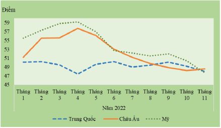 Hình 2: Chỉ số PMI sản xuất của châu Âu, Trung Quốc và Mỹ