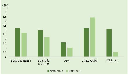 Theo Bloomberg, năm 2022 là một năm ảm đạm với nền kinh tế toàn cầu và năm 2023 có thể còn kém khả quan hơn nhiều. Nhiều tổ chức quốc tế điều chỉnh giảm triển vọng tăng trưởng toàn cầu và tăng dự báo lạm phát năm 2023. Theo đó, (i) Tháng 10/2022, Quỹ Tiền tệ quốc tế (IMF) hạ dự báo GDP toàn cầu năm 2023 xuống 2,7% (giảm 0,2 điểm phần trăm so với dự báo tháng 7/2022); lạm phát tăng lên 8,8% trong năm 2022 (tăng 0,5 điểm phần trăm so với dự báo tháng 7/2022), trước khi giảm xuống mức 6,5% năm 2023; (ii) Tháng 10/2022, Tổ chức Thương mại thế giới (WTO) hạ dự báo tăng trưởng năm 2023 xuống 2,3% (giảm 0,9 điểm phần trăm so với dự báo trước đó); (iii) Tổ chức Hợp tác và Phát triển Kinh tế (OECD) dự báo ở mức 2,2%, giảm 0,6 điểm phần trăm so với dự báo trước đó. (Hình 3)