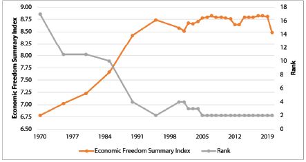 Theo đánh giá từ bộ chỉ số EFW, mức điểm tự do kinh tế của Singapore đã tăng từ 6,78 vào năm 1970 lên 8,48 vào năm 2020, đưa thứ hạng của Singapore từ 17 lên vị trí thứ 2 trong bảng xếp hạng mức độ tự do kinh tế. Mức xếp hạng thứ 2 được Singapore duy trì từ năm 2005 cho tới nay, chỉ xếp sau Hồng Kông (Trung Quốc), cho thấy định hướng và chính sách đúng đắn của Singapore trong công cuộc xây dựng nền kinh tế tự do.