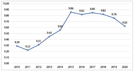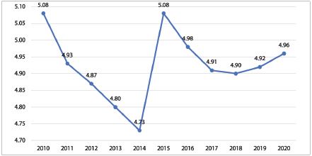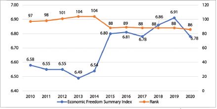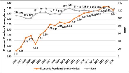 Nhìn chung, chỉ số tự do kinh tế của Trung Quốc tăng dần trong giai đoạn 2010 - 2020; tuy nhiên, xếp hạng về tự do kinh tế của Trung Quốc vẫn thấp hơn mức trung bình của thế giới và không được cải thiện theo thời gian, điểm số tự do kinh tế của Trung Quốc năm 2020 là 6,27, xếp hạng thứ 116/165 quốc gia được khảo sát. (Hình 5)