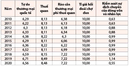 Điểm chỉ số tự do thương mại quốc tế và các chỉ số thành phần của Trung Quốc nhìn chung có xu hướng gia tăng đều qua các năm, cho thấy quốc gia này ngày càng hội nhập sâu rộng hơn vào nền kinh tế quốc tế. (Bảng 1)