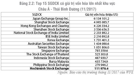 TTCK Việt Nam tăng trưởng trở lại và trở thành một trong những TTCK có mức tăng trưởng nhanh nhất trong khu vực và trên toàn thế giới trong năm 2017. Giá trị vốn hóa thị trường trong nước tăng nhanh cũng góp phần đưa TTCK Việt Nam lên các thứ hạng cao hơn trong danh sách các TTCK thế giới. Nếu xét trên quy mô giá trị vốn hóa của các SGDCK quốc gia trong khu vực Châu Á - Thái Bình Dương, SGDCK Hồ Chí Minh đã có sự tăng hạng đáng kể từ mức 17/18 trong các năm 2014 đến 2017 đã tăng lên mức 15/18. Nếu xét trên tổng số các SGDCK quốc gia là thành viên của WFE tại khu vực này, SGDCK Hồ Chí Minh xếp thứ 15/21 và SGDCK Hà Nội xếp thứ 19/21. (Bảng 2.1)