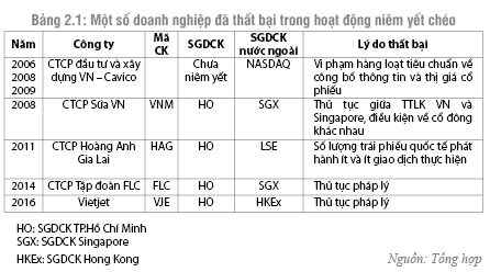 Theo thống kê chưa đầy đủ từ thông báo về thực hiện niêm yết trên thị trường quốc tế của các doanh nghiệp Việt Nam trong thời gian qua, hiện chỉ có một số ít doanh nghiệp đã thực hiện phát hành cổ phiếu, chứng chỉ lưu ký tại thị trường quốc tế như Cavico, Hoàng Anh Gia Lai. Tuy nhiên, hoạt động duy trì niêm yết gặp khó khăn nên sau một thời gian những doanh nghiệp này đã thực hiện hủy niêm yết. Một số công ty khác như Vinamilk, FLC, Vietjet Air đều đã đưa kế hoạch xong đã thất bại hoặc chưa thực hiện. Đáng chú ý trong năm 2017, VNG đã đưa ra thông báo đạt được thỏa thuận chào bán cổ phiếu lần đầu tại NASDAQ, và Vietjet Air đã dự kiến niêm yết trên SGDCK Singapore. Tuy vậy, cho tới hiện nay vẫn chưa ghi nhận doanh nghiệp Việt Nam nào thực hiện niêm yết chéo trên thị trường thế giới. Như vậy, câu chuyện về niêm yết chéo đã được các doanh nghiệp Việt Nam nhắc tới từ năm 2006 cho tới nay vẫn chưa thành hiện thực. (Bảng 2.2)