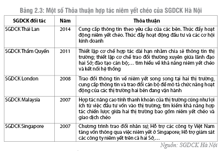 Hoạt động hợp tác và liên kết quốc tế của các SGDCK tại Việt Nam đã được chú trọng đẩy mạnh trong thời gian qua. Năm 2013, SGDCK TP. Hồ Chí Minh được chấp thuận làm thành viên chính thức của Liên đoàn các SGDCK thế giới - WFE đã tháo gỡ được một trong những khó khăn về đáp ứng điều kiện niêm yết quốc tế của doanh nghiệp Việt Nam - buộc SGDCK mà doanh nghiệp đã niêm yết phải là thành viên của WFE. Ngoài ra, trong nhiều năm từ 2007 tới nay, SGDCK Hà Nội cũng đã thực hiện ký kết thỏa thuận hợp tác với một số SGDCK trong khu vực như Thái Lan, Singapore, Malaysia,… Nội dung các thỏa thuận xoay quanh vấn đề về trao đổi thông tin, thúc đẩy hoạt động niêm yết chéo tại các SGDCK trong khu vực. Thêm vào đó, Nghị định 58/2015/NĐ-CP có quy định một trong những điều kiện niêm yết tại SGDCK nước ngoài là doanh nghiệp cần thực hiện niêm yết tại các SGDCK của nước mà cơ quan quản lý TTCK hoặc SGDCK đã có thỏa thuận hợp tác với UBCKNN hoặc SGDCK của Việt Nam.[4] (Bảng 2.3)