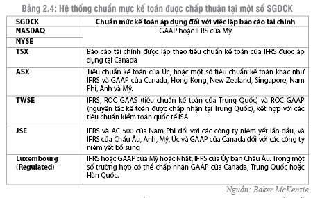Chuẩn mực kế toán tại các TTCK quốc tế hiện là một rào cản lớn của doanh nghiệp Việt Nam. Nguyên nhân xuất phát từ sự khác biệt trong một số tiêu chí lập báo cáo tài chính so với chuẩn mực kế toán quốc tế. Tại các SGDCK thế giới, chuẩn mực kế toán được đưa ra chung cho các doanh nghiệp nước ngoài muốn niêm yết thường là các chuẩn mực hoặc thông lệ kế toán đã được áp dụng chung trên toàn cầu và được chấp nhận bởi rất nhiều các quốc gia trên thế giới như GAAP của Mỹ, Canada hay Nhật, IFRS, IAS. Hoặc doanh nghiệp phải chấp thuận theo chuẩn mực kế toán của quốc gia đó. Điều đáng nói là chuẩn mực kế toán Việt Nam hiện đang áp dụng (VAS) có một số sự khác biệt trong các lập các báo cáo, hệ thống tài khoản,… so với IFRS hay IAS. (Bảng 2.4)