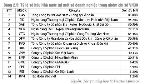 Vấn đề về tỷ lệ sở hữu đặt ra thách thức không nhỏ khi doanh nghiệp muốn huy động vốn từ thị trường quốc tế. Đối với tỷ lệ sở hữu cổ phần có hai vấn đề đặt ra với doanh nghiệp. Thứ nhất, tỷ lệ sở hữu của cổ đông Nhà nước tại một số doanh nghiệp cổ phần hóa còn khá cao, gây khó khăn cho việc chào bán cổ phiếu ra nước ngoài để đảm bảo tỷ lệ cổ phần do công chúng nhà đầu tư nắm giữ. Đáng chú ý, nhóm 30 doanh nghiệp trong chỉ số VN30 có tới 10 doanh nghiệp có tỷ lệ sở hữu của cổ đông Nhà nước trên 20%. Trong đó, 4 doanh nghiệp là GAS, BID, SAB và VCB có tỷ lệ sở hữu Nhà nước trên 70%. Đây là rào cản rất lớn cho doanh nghiệp khi quyết định huy động vốn trên thị trường quốc tế, tỷ lệ sở hữu của cổ đông nhà nước cao đồng nghĩa với việc thực hiện quyền phủ quyết của cổ đông này. Điều này sẽ ảnh hưởng lớn tới quyền biểu quyết của các cổ đông khác trong doanh nghiệp và không đảm bảo tính công bằng cho các cổ đông cá nhân đại chúng của công ty. (Bảng 2.5)