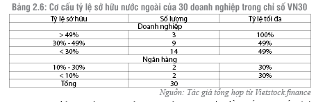 Thứ hai, tỷ lệ sở hữu nước ngoài tại nhiều doanh nghiệp Việt Nam hiện đã đạt mức cao. Trong nhóm chỉ số VN30 có 12/30 doanh nghiệp có tỷ lệ sở hữu nước ngoài từ 30%, đặc biệt, VNM, CII và SSI là có tỷ lệ sở hữu trên 50% do điều lệ công ty đã thông qua phương án tăng tỷ lệ sở hữu nước ngoài lên tối đa 100%. 3/9 doanh nghiệp có tỷ lệ sở hữu nước ngoài đạt mức tối đa 49% và 2 doanh nghiệp đạt mức trên 48%. Khả năng tăng vốn thông qua phát hành và niêm yết quốc tế của nhóm doanh nghiệp này rất khó. Ngoài ra, các doanh nghiệp còn lại có tỷ lệ sở hữu nước ngoài trên 30% sẽ bị hạn chế khi muốn phát hành thêm chứng khoán ở thị trường nước ngoài nếu tỷ lệ sở hữu tối đa là 49%. Đối với nhóm ngân hàng, có 4 ngân hàng thuộc nhóm VN30, trong đó có 2 ngân hàng là VCB và MBB đã có tỷ lệ sở hữu nước ngoài ở mức 20%, với 10% vốn còn lại cũng là một thách thức khi muốn huy động vốn từ thị trường thế giới. (Bảng 2.6)