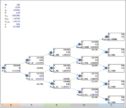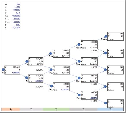 Ví dụ, xét một trái phiếu trả lãi định kỳ hằng năm 6,5% với thời gian đáo hạn còn lại 4 năm, có thể được mua lại trong 1 năm ở mức giá 100 nghìn đồng. Nhà phân tích sẽ định giá trái phiếu này bằng cách sử dụng cây nhị thức ở Bảng 1. Bảng 3 cho thấy các giá trị tại mỗi nút của cây nhị thức. Quy trình chiết khấu tương tự như quy trình được trình bày trong Bảng 1.