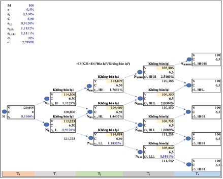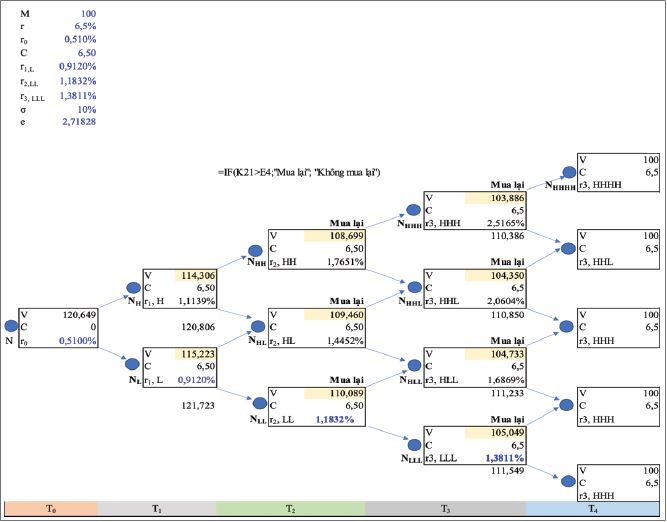 Cần lưu ý phương pháp thay đổi dòng tiền trong quá trình định giá trái phiếu có thể mua lại. Trong năm thứ ba, ví dụ, tại nút NHHL, quá trình định giá lặp lại tạo ra PV là 104,733. Với quy tắc mua lại, trái phiếu sẽ được nhà phát hành mua lại. Do đó, 100 sẽ được hiển thị là giá trị thứ hai (giá trị thay thế) tại nút và chính giá trị này sau đó được sử dụng khi quá trình định giá tiếp tục. Tiếp tục thay thế giá trị các nút tại các nút đủ điều kiện mua lại (NH, NL của năm thứ nhất, NHL của năm thứ hai) vào bảng tính MS Excel, giá trị cuối cùng của trái phiếu có thể mua lại này là 120,649 nghìn đồng (Bảng 5).