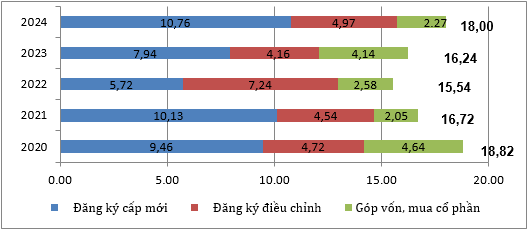 Vốn đầu tư nước ngoài đăng ký vào Việt Nam tính đến ngày 20/7 các năm 2020 - 2024 (tỉ USD)