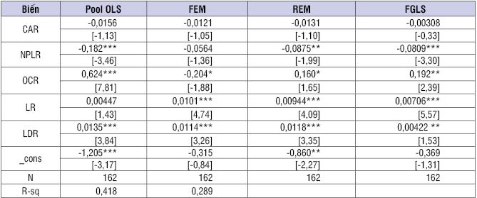 Thống kê mô tả của dữ liệu được sử dụng trong nghiên cứu hiện tại cho giai đoạn 2016 - 2021 được trình bày trong Bảng 2. Theo đó, giá trị trung bình của ROA là 0,951 và đạt giá trị lớn nhất là 3,58, có nghĩa là mỗi đồng tài sản ngân hàng đầu tư mang lại tỉ suất lợi nhuận trung bình 0,951%, cao nhất lên tới 3,58% và mức tối thiểu là 0,01%. CAR có giá trị trung bình là 10,388%, giá trị tối thiểu là 2,7% và giá trị tối đa là 23,36%. Giá trị trung bình của CAR cho thấy hầu hết các NHTM đều đạt hệ số CAR đáp ứng quy định của Ngân hàng Nhà nước Việt Nam (NHNN). Giá trị trung bình của NPLR là 1,578% với giá trị nhỏ nhất là 0,01% và giá trị lớn nhất là 6,81%. Điều này có nghĩa là 1,578% các khoản cho vay của các ngân hàng trong giai đoạn nghiên cứu là các khoản nợ xấu. Ngoài ra, OCR có giá trị trung bình là 1,735% với giá trị nhỏ nhất là 0,01% và giá trị lớn nhất là 4,13%.