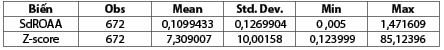 Trong giai đoạn 2013 - 2019, về chỉ số Z-score, chỉ số này có sự phân hóa cao với mức chênh lệch đáng kể giữa giá trị nhỏ nhất và giá trị lớn nhất. Theo tổng hợp và tính toán của nhóm tác giả, một ngân hàng có ghi nhận giá trị Z-score nhỏ nhất vào quý IV/2017 là 0,123 và có một ngân hàng ghi nhận giá trị Z-score lớn nhất vào quý I/2018 là 85,123. Bên cạnh đó, theo tính toán của nhóm tác giả, điểm Z-score của nhiều ngân hàng cũng tăng đáng kể trong năm 2018. Trung bình Z-score cho 24 NHTM tại Việt Nam là 7,309. Chen và cộng sự (2017) đã tiến hành tính toán giá trị Z-score với nền kinh tế của Trung - Đông Âu, Mỹ Latinh và châu Á, từ đó, cho ra giá trị bình quân của các mẫu nghiên cứu là 24,61 - một con số rất lớn so với Việt Nam. Theo Brana và cộng sự (2019), chỉ số Z-score trung bình cho 20 quốc gia hàng đầu châu Âu là 28,22 trong giai đoạn 2000 - 2015. Như vậy, các nước phát triển với hệ thống ngân hàng lâu đời có mức độ ổn định tài chính cao hơn so với các nước đang phát triển.