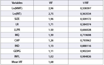Nhóm nghiên cứu tiếp tục thực hiện kiểm định để kiểm tra hiện tượng đa cộng tuyến dựa trên hệ số phóng đại phương sai VIF (Variance Inflation Factor). Trong đó, nếu VIF > 10 thì có hiện tượng đa cộng tuyến, có thể ảnh hưởng nghiêm trọng đến kết quả ước lượng của mô hình. Dựa trên kết quả Bảng 4, hệ số VIF của tất cả 10 yếu tố đều nhỏ hơn 3 và trung bình VIF là 1,68, suy ra không có hiện tượng đa cộng tuyến với các biến đã chọn. Vì vậy, nhóm nghiên cứu giữ nguyên các biến trên để thực hiện các hồi quy khác.