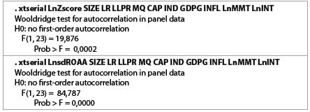 Bài nghiên cứu sử dụng mô hình hồi quy đa biến, với 02 biến phụ thuộc là Ln(Z-score), Ln(SdROAA) và 10 biến giải thích là SIZE, LR, LLPR, MQ, CAP, IND, GDPG, INFL, Ln(MMT), Ln(INT). Sau khi sử dụng mô hình tác động ngẫu nhiên REM để ước lượng, nhóm tác giả tiến hành xác định các khuyết tật của mô hình. Kết quả kiểm định hiện tượng phương sai sai số thay đổi (kiểm định Breusch Pagan Lagrangian Multiplier) và hiện tượng tự tương quan (kiểm định Wooldridge) được thể hiện ở Bảng 5.
