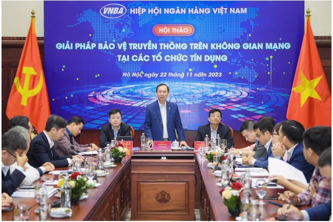 Ngày 22/11/2023, tại Hà Nội, Hiệp hội Ngân hàng Việt Nam (VNBA) đã tổ chức Hội thảo “Giải pháp bảo vệ truyền thông trên không gian mạng tại các tổ chức tín dụng”. Tham dự Hội nghị có Phó Thống đốc Thường trực Ngân hàng Nhà nước Việt Nam (NHNN) Đào Minh Tú; Thứ trưởng Bộ Thông tin và Truyền thông Nguyễn Thanh Lâm; Phó Chủ tịch kiêm Tổng Thư ký VNBA Nguyễn Quốc Hùng cùng đại diện Vụ Báo chí và Xuất bản (Ban Tuyên giáo Trung ương), Cục Phát thanh, truyền hình và Thông tin điện tử, Cục Báo chí, Sở Thông tin và Truyền thông Hà Nội, đại diện các hội viên thuộc VNBA…