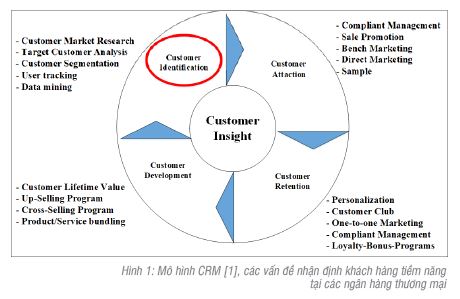 Theo tiến sỹ V.L.M. Oliveira (2012)[1], quản trị quan hệ khách hàng (CRM: Customer Relationship Management) [Hình 1] là một công cụ không thể thiếu trong các ngân hàng nhằm giúp họ xây dựng chiến lược kinh doanh tốt hơn. CRM gồm 4 giai đoạn chính: Nhận diện khách hàng, thu hút khách hàng, chăm sóc khách hàng, phát triển khách hàng (Customer Identification, Customer Attraction, Customer Retention, Customer Development).