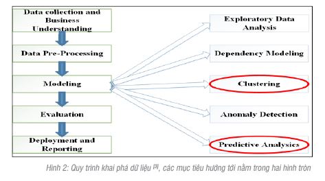 Khai phá dữ liệu với mục đích là khám phá tri thức từ dữ liệu để hỗ trợ ra quyết định, đây là phương pháp hiệu quả giúp chúng ta cải thiện được tình trạng bị tràn ngập trong dữ liệu nhưng thiếu thông tin. Quá trình đó được Vipin Kumar [3] tổng kết trong [Hình 2]. Bên trái là thứ tự các bước trong khai phá dữ liệu gồm: Lựa chọn dữ liệu và xác định vấn đề nghiên cứu (Data Collection and Business Understanding), tiền xử lý dữ liệu (Data Pre-Processing), xây dựng mô hình (Modeling), đánh giá kết quả đạt được (Evaluation), thực hiện và báo cáo (Deployment and Reporting). Bên phải là các nhiệm vụ của khai phá dữ liệu ở mức độ cao. Có nhiều mô hình có thể được phát triển, tuy nhiên, việc lựa chọn mô hình nào cho phù hợp cũng là một bài toán cần giải quyết trong bài toán lớn khai phá dữ liệu. Các mô hình gồm có: mô hình phân tích dữ liệu thăm dò (Exploratory Data Analysis), mô hình phụ thuộc (Dependency Modeling), mô hình phân cụm (Clustering), mô hình phát hiện các yếu tố bất thường (Anomaly Detection), mô hình phân tích dự báo (Predictive Analysics).