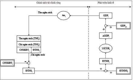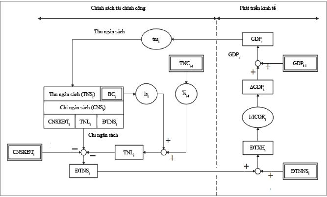Trong mô hình này, chi ngân sách của năm i (CNSi) bằng thu ngân sách năm i (TNSi). Chi ngân sách được sử dụng để chi thường xuyên năm i (CTXi), chi đầu tư phát triển từ ngân sách năm i (ĐTNSi) và các chi khác (dự trữ quốc gia, quỹ dự trữ tài chính, viện trợ, chi khắc phục thiên tai, dịch bệnh,…). Chi thường xuyên và chi khác gọi chung là chi ngân sách không đầu tư (chi ngân sách không đầu tư năm i - CNSKĐTi). Đầu tư xã hội ngoài ngân sách (đầu tư ngoài ngân sách năm i - ĐTNNSi) là đầu tư của doanh nghiệp tư nhân trong nước (ĐTDNi) và doanh nghiệp nước ngoài (FDIi). Tổng đầu tư xã hội (đầu tư xã hội năm i - ĐTXHi) là tổng của đầu tư từ ngân sách và đầu tư ngoài ngân sách. Giá trị GDP năm i-1 là GDPi-1, giá trị GDP gia tăng sau 1 năm là ∆GDPi. Với hệ số ICORi ta xác định được ∆GDPi qua ĐTXHi/ICORi. TNSi được xác định qua công thức: TNSi = tnsi x GDPi, với tnsi là tỉ lệ thu ngân sách/GDP của mỗi năm. Ở các nước tỉ lệ này biến đổi chậm nên trong ngắn hạn có thể xem là hằng số. Ở Việt Nam, bình quân giai đoạn 2006 - 2020, tns = 25% GDP. Như vậy, ta có mô hình phát triển kinh tế dựa vào cân bằng ngân sách nhà nước như Hình 1.
