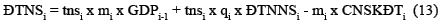 - Thành phần thứ nhất: tnsi x mi x GDPi-1 + tnsi x qi x (ĐTNNSi - CNSKĐTi), cho thấy TNSi phụ thuộc vào GDPi-1, ĐTNNSi và CNSKĐTi mà không liên quan đến BCi và TNCi-1. Tức là, đây là phần thu ngân sách của năm i không phụ thuộc vào quyết định bội chi của năm i và tổng nợ công của các năm trước, hay nói gọn là thu ngân sách không có tác động của bội chi và tổng nợ công trong năm i (so sánh phương trình (14) của mô hình phát triển kinh tế dựa vào cân bằng ngân sách).